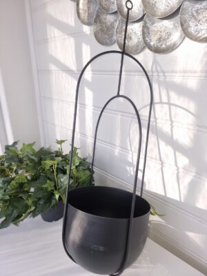 Ampel till blommor i svart metall. Lång / hög ampel med kruka i svart metall.