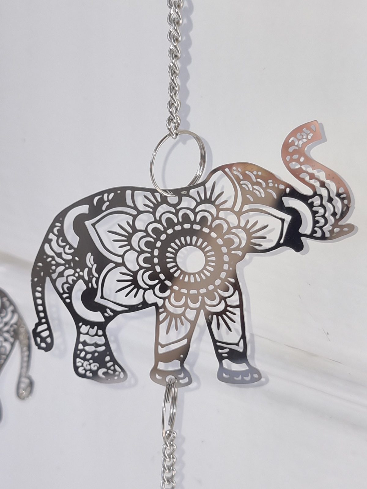 Drömfångare i silver metall elefant. Dekorativ drömfångare i silver metall med elefanter, kristall och ringar med utstansat mönster.