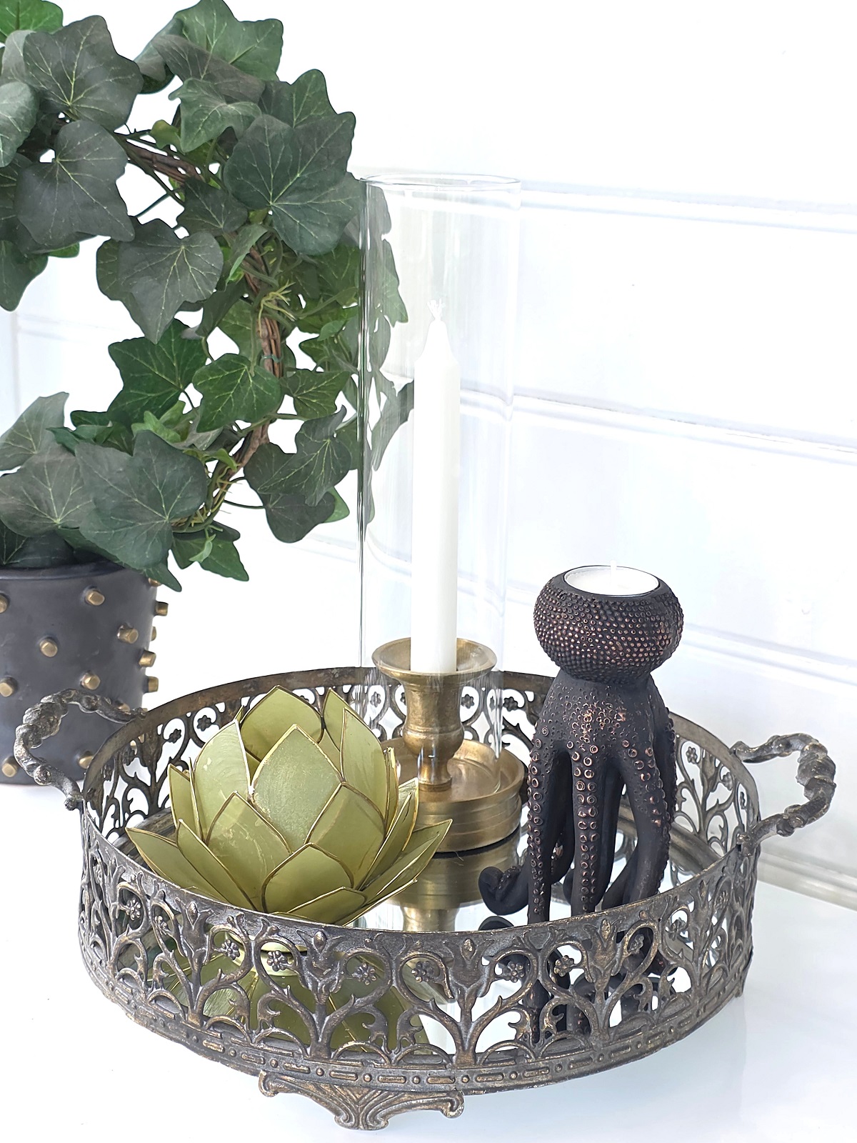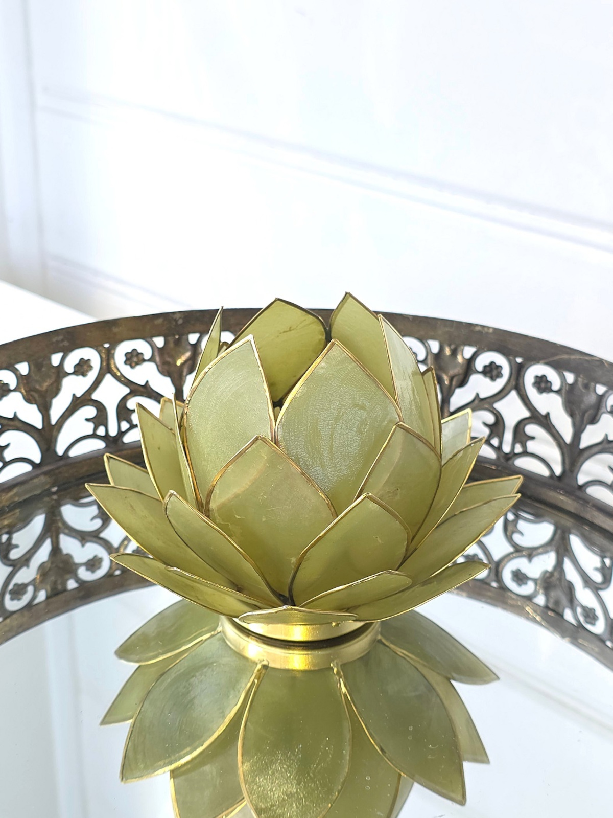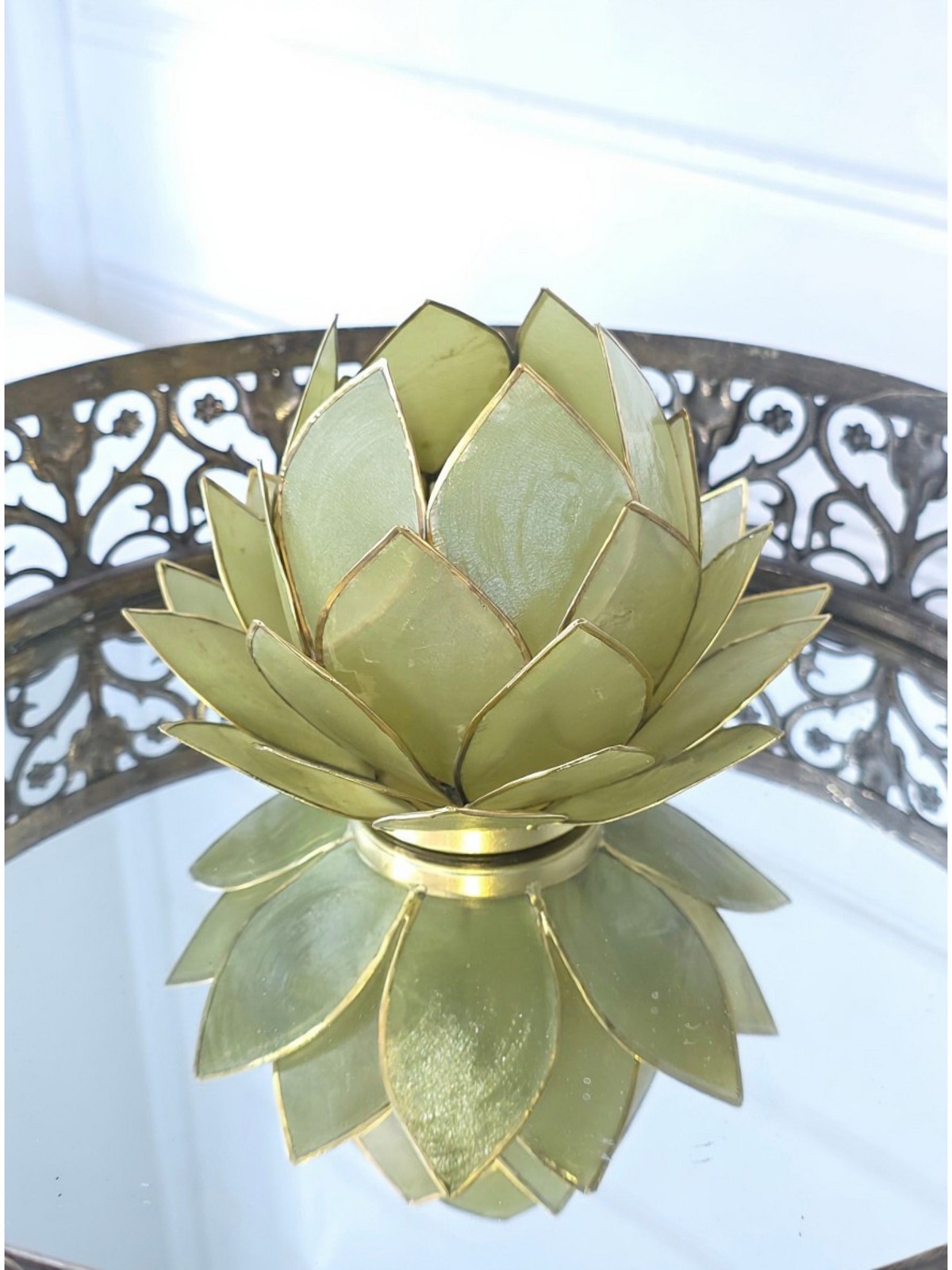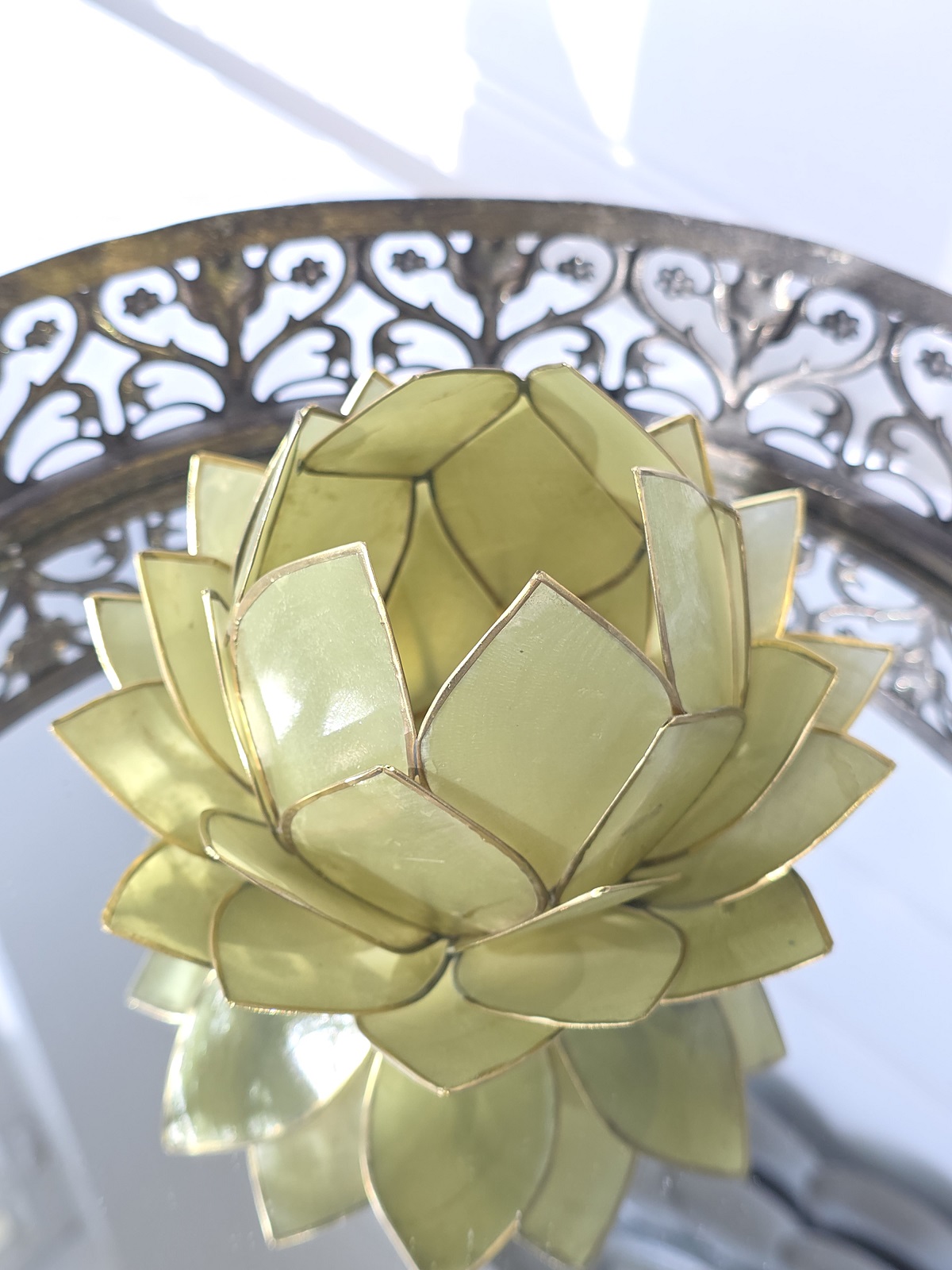 Stor lotuslykta med kanter och botten i guld. Färgen på lyktan är grön som mossa med plats för ett värmeljus. Lyktan är tillverkad av snäckskal så alla är olika. En grön lotuslykta med guldkant att placera på en bricka eller för sig själva som en mysig detalj i din inredning.