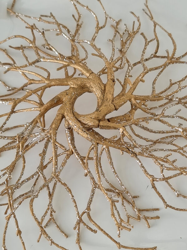 - Guld dekoration i styvt plast, inte platt utan lite utsvängd, kan användas år efter år. Nylonband för upphängning.