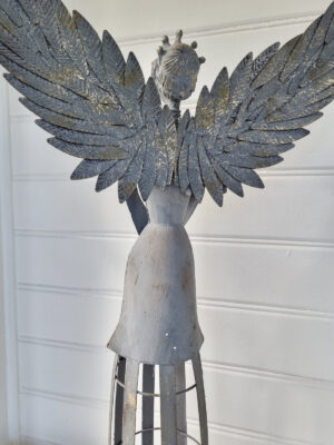 Hög ängel i plåt med filigran dekor. Letar du efter en annorlunda hög ängel som inte alla andra har? Då kanske hög ängel i plåt med krona och en fågel i handen är något för dig? Annorlunda hög ängel med fina detaljer att ställa på golvet. Går inte att öppna klänningen men det går att sätta dit ett stort värmeljus eller en ljusslinga. Även änglavingar kan du hitta hos oss.