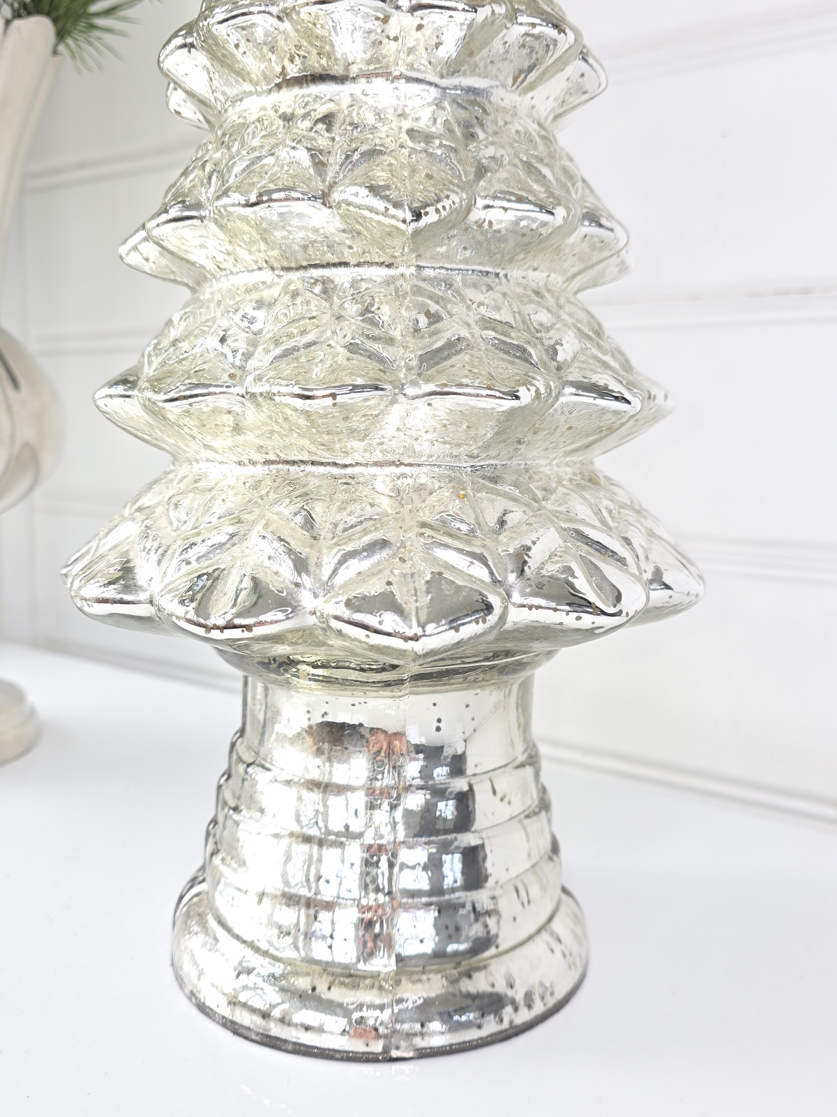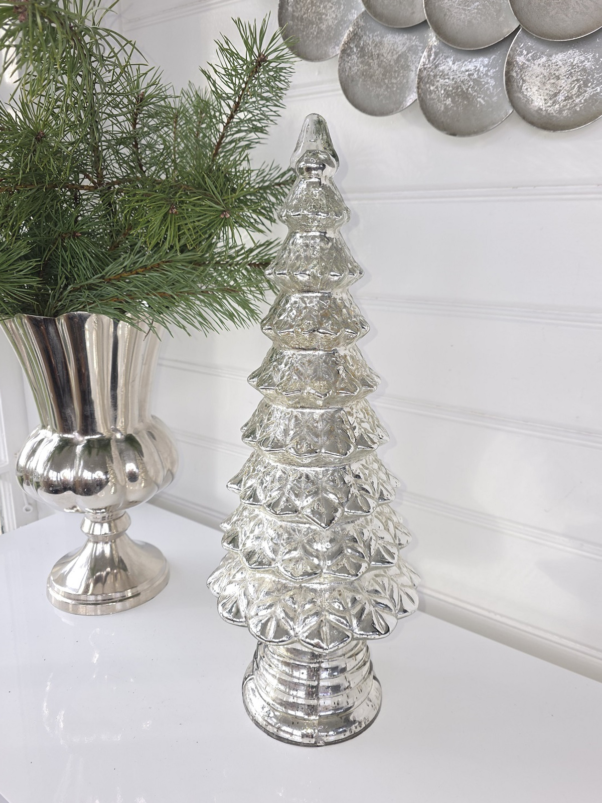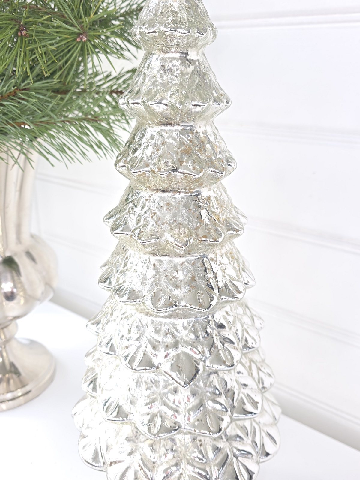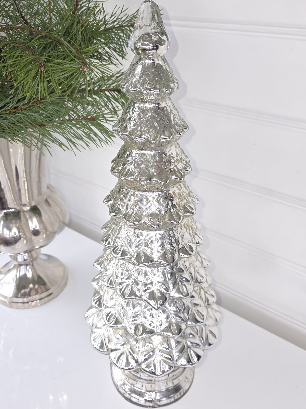 Hög julgran i fattigmanssilver med lyster i glaset att dekorara med inför julen.