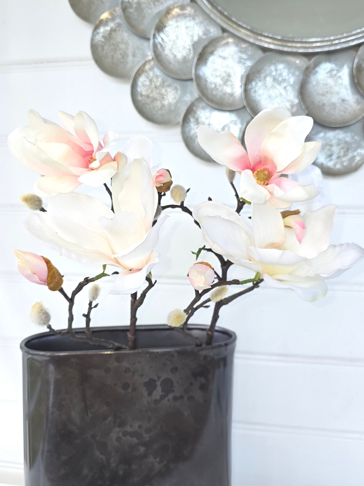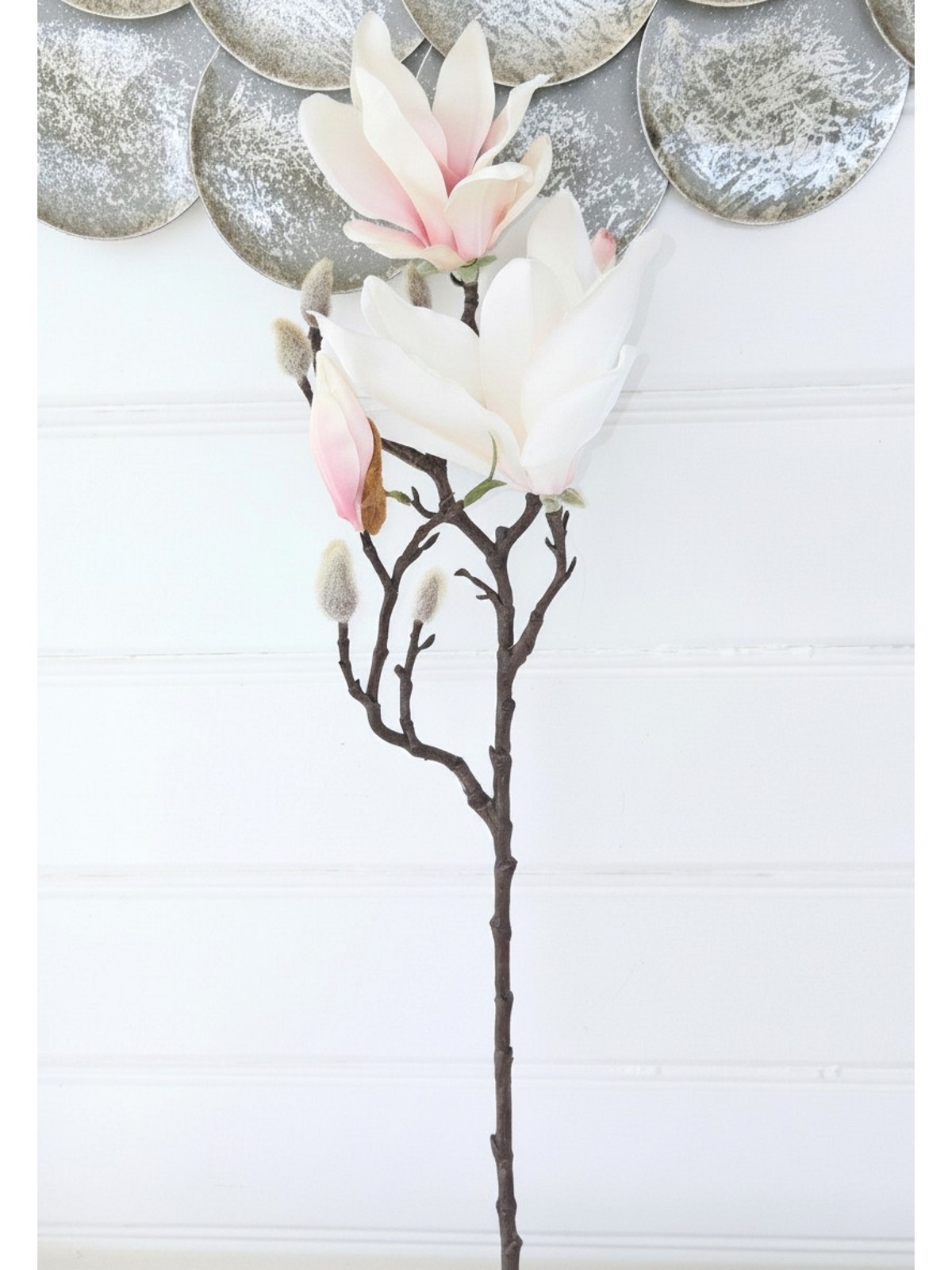 Konstgjord magnolia med rosa inslag att samla i en vas för en fräsch dekoration utan underhåll år efter år. En välgjord magnolia på brun stjälk med knoppar och stora vita blommor med inslag av rosa som ser naturtrogen ut.