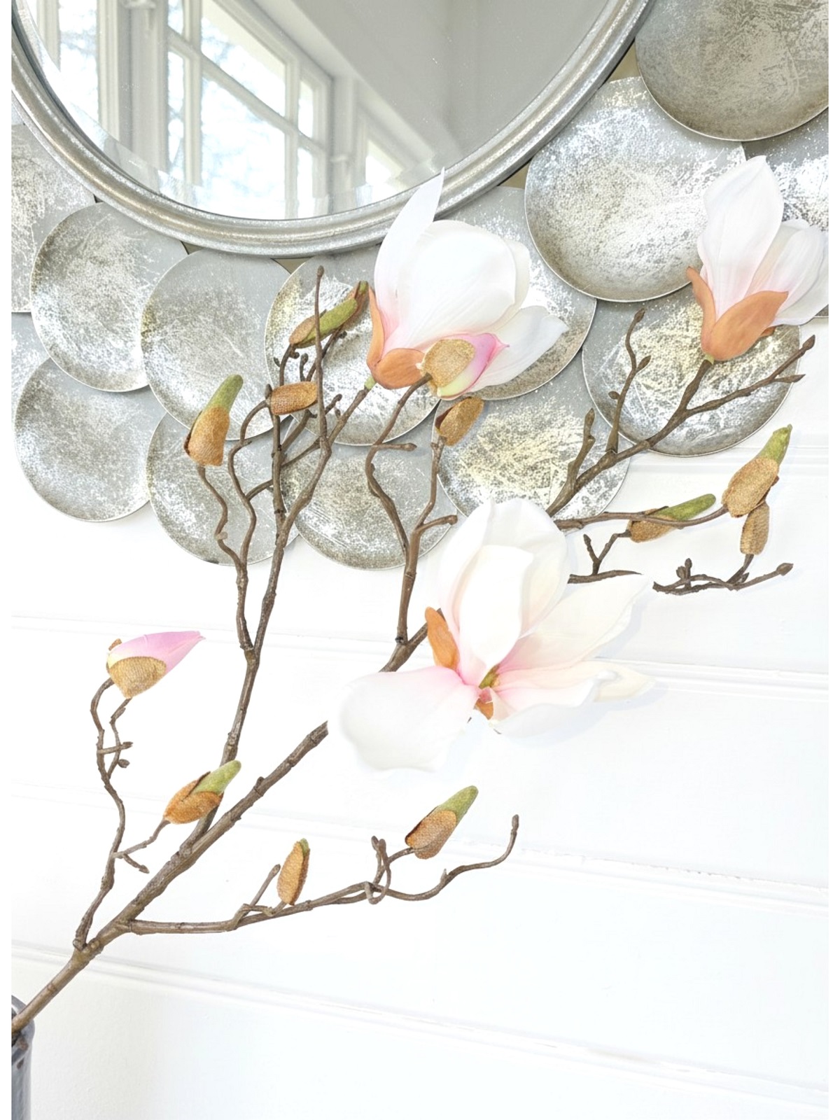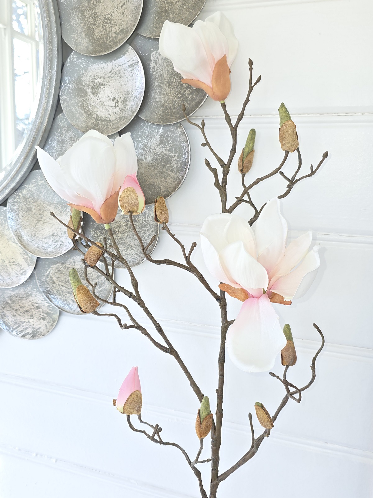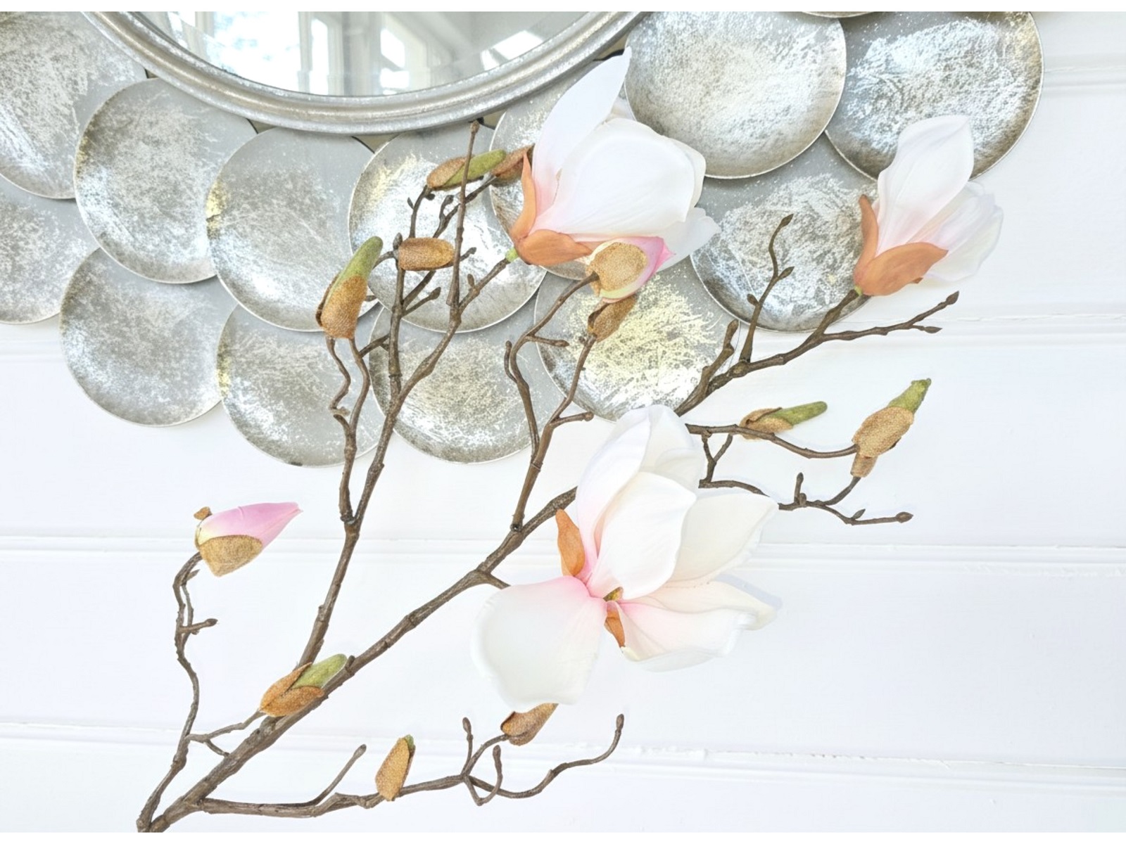 Konstgjord vit rosa magnolia med blommor och knoppar på en lång stjälk. Naturtrogen magnolia med stora blommor att sätta i en vas för en fräsch dekoration utan underhåll. Blommorna är vita med inslag av rosa och tillverkade i tyg. Stjälken är brun i plast med ståltråd så det går att forma blomman så den passar i din vas.