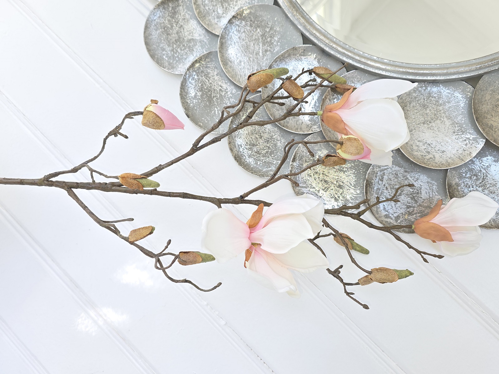 Konstgjord vit rosa magnolia på lång stjälk att dekorera med i en vas.