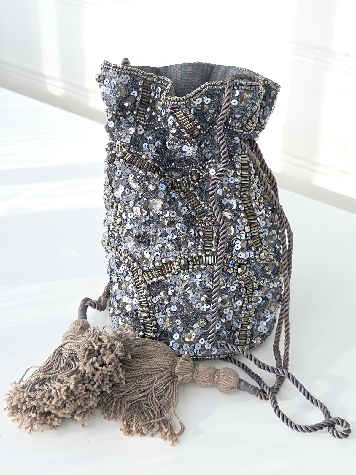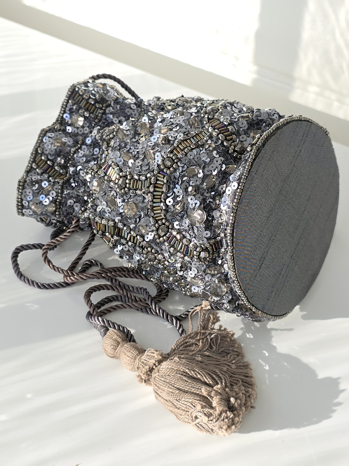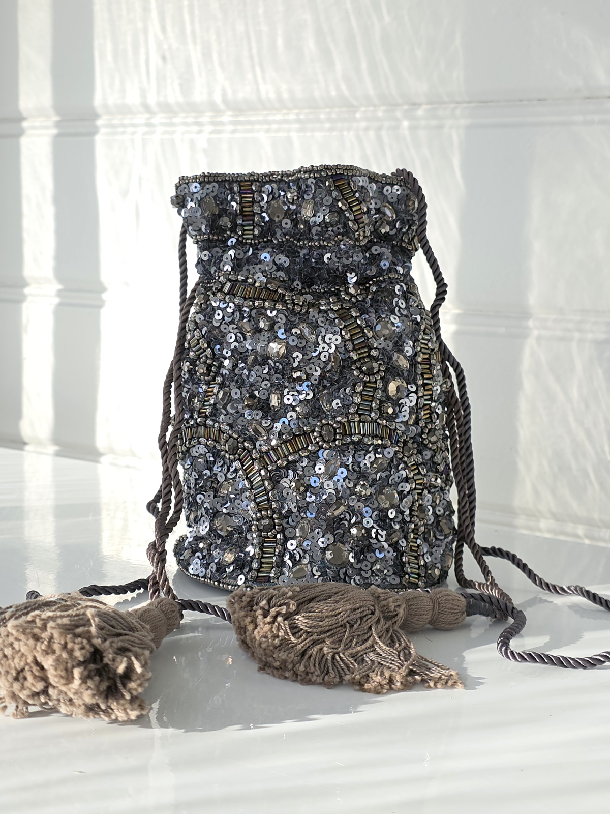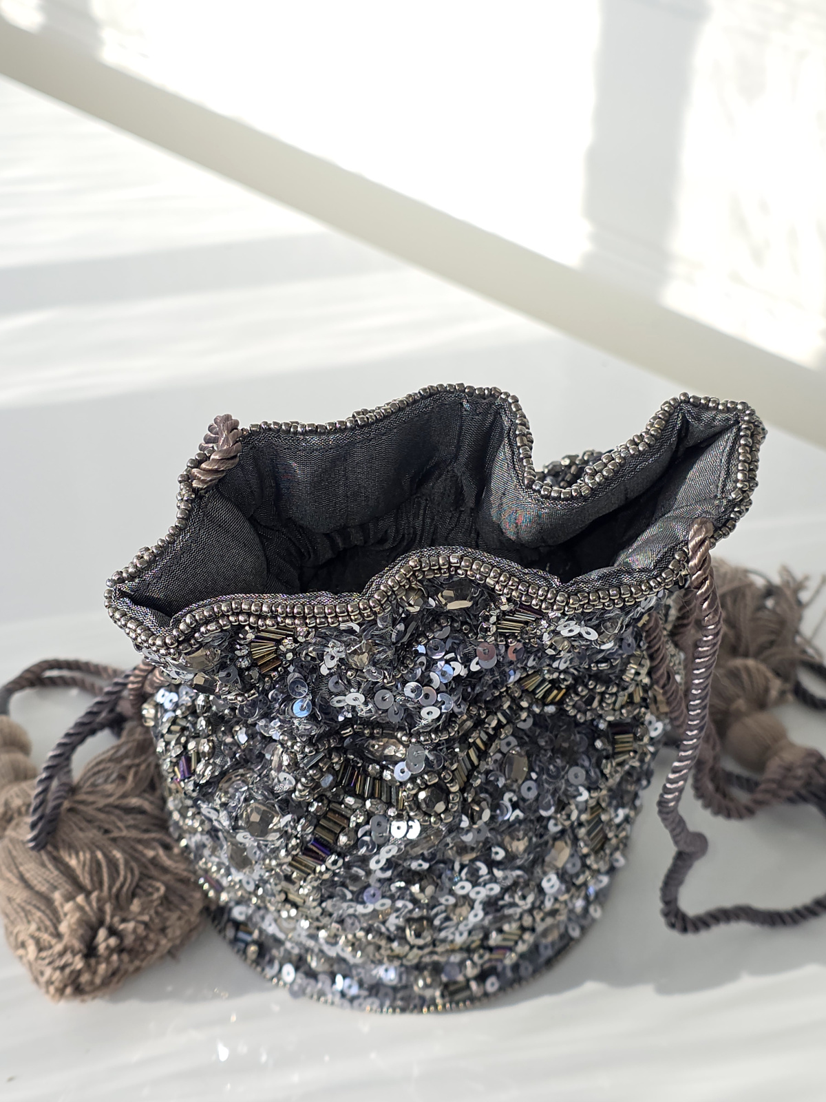 Kvällsväska med paljetter och dragsko med tofsar. Ett fack, rund styv botten och band som axelrem.