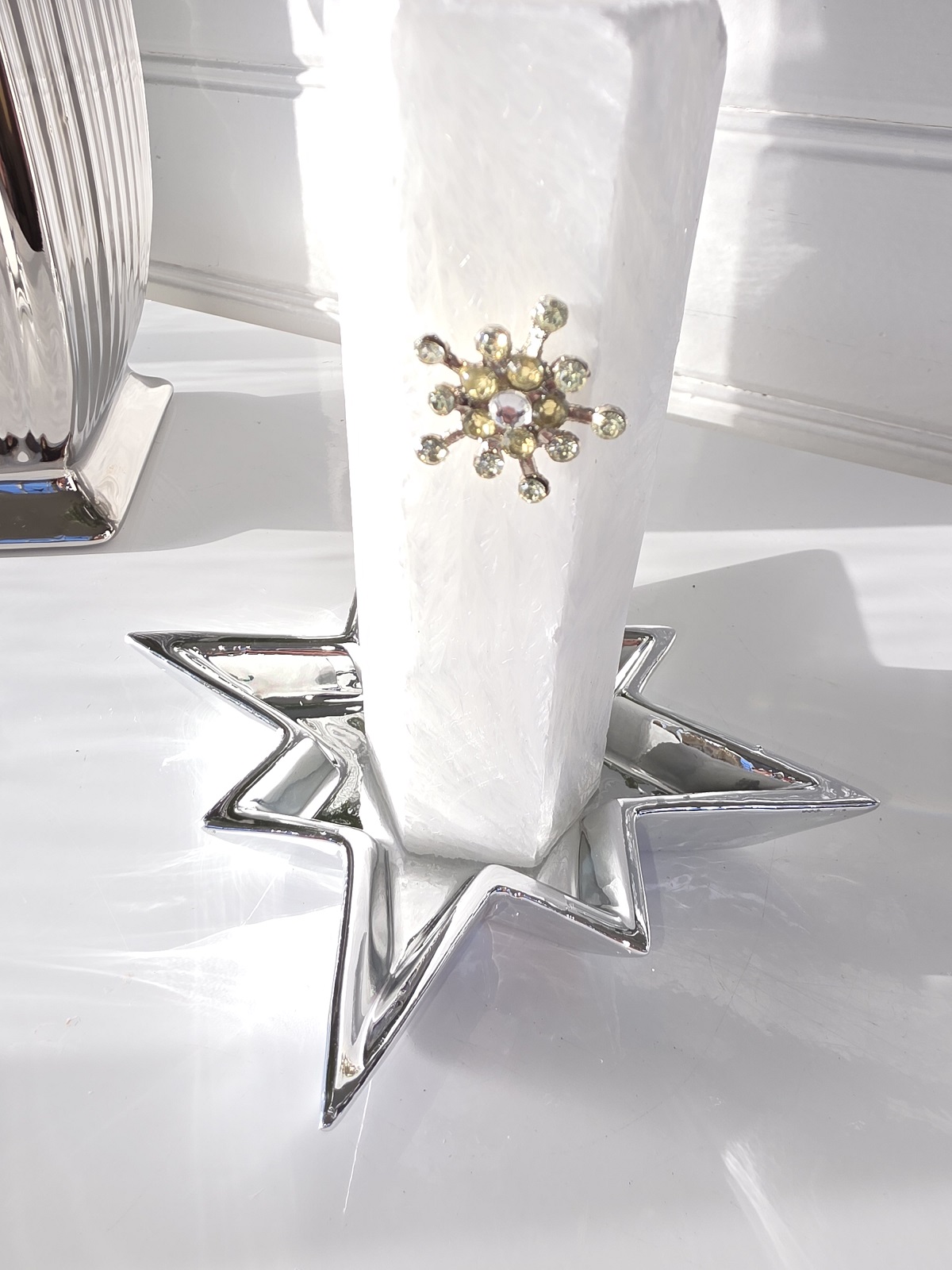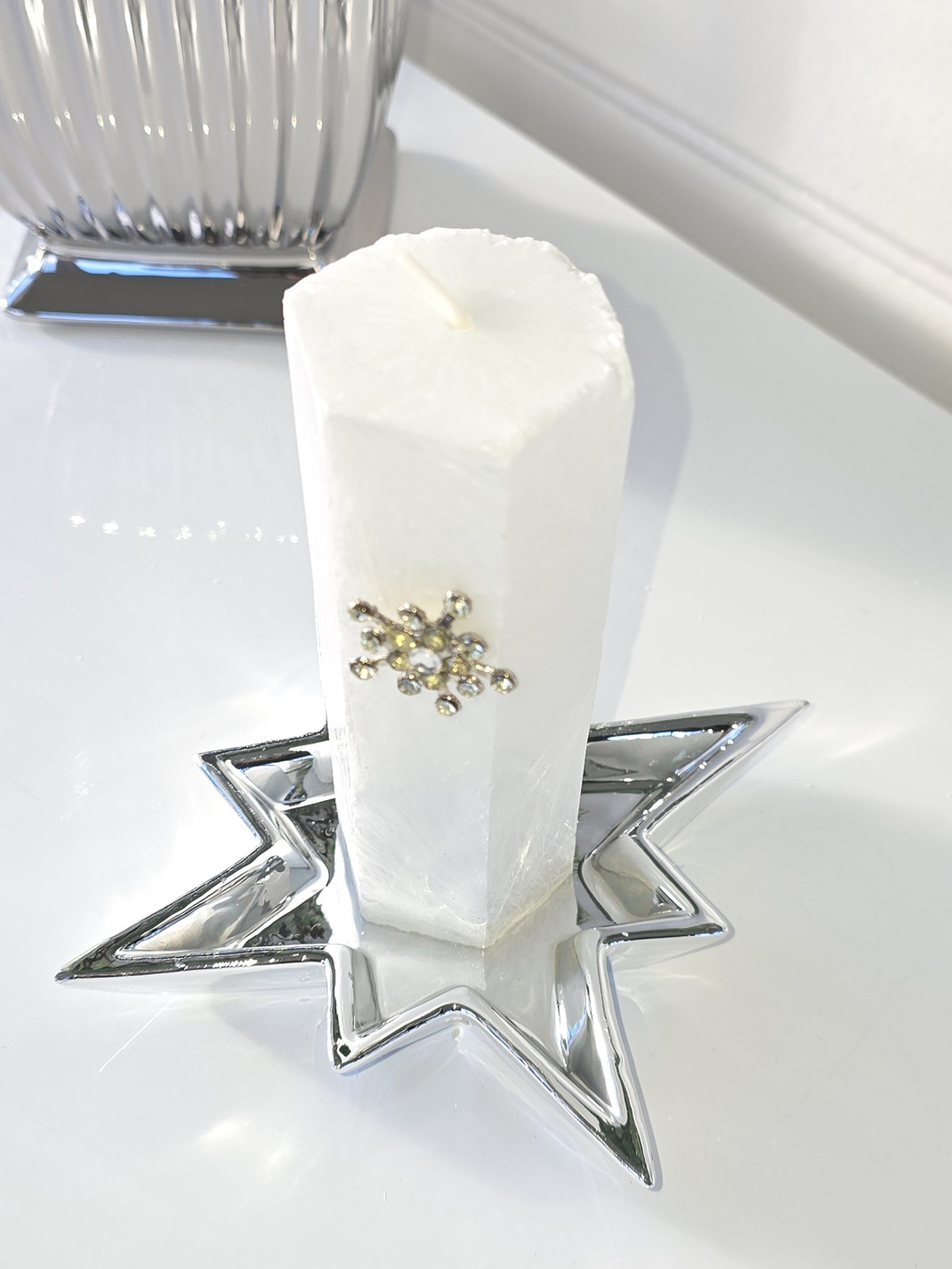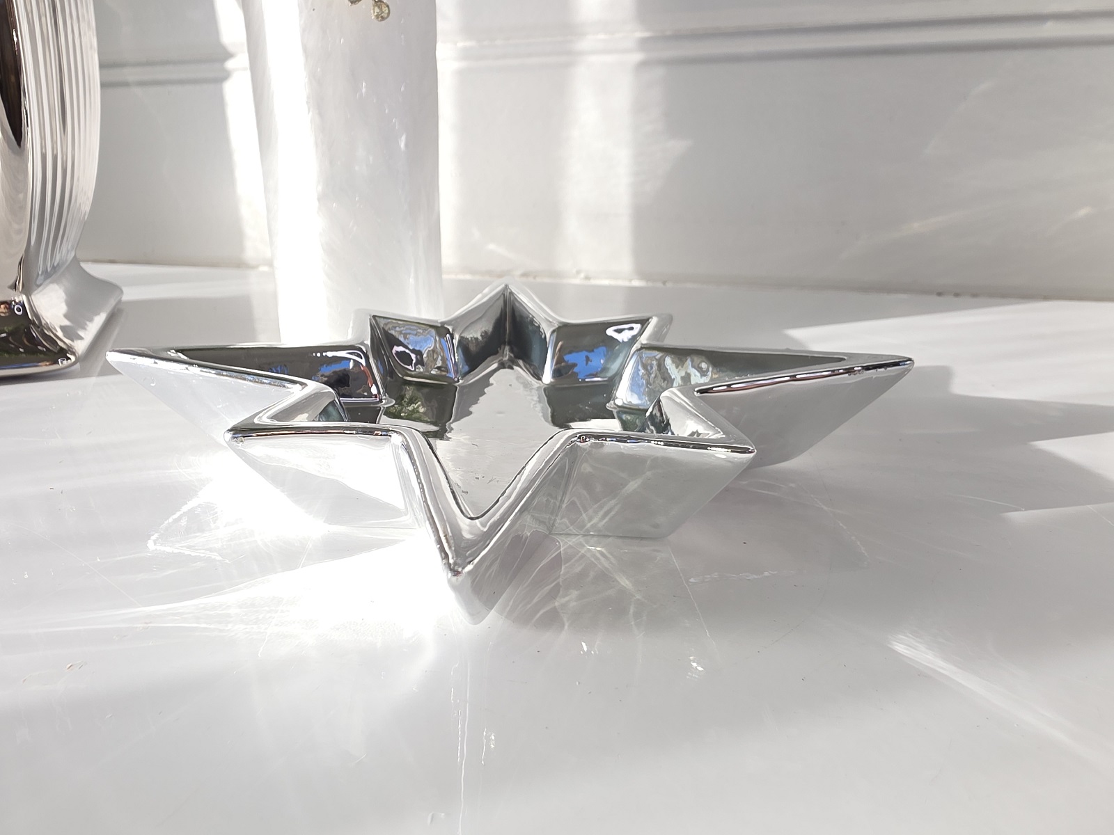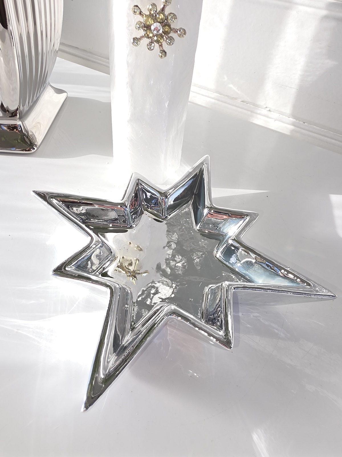 Litet fat stjärna i silver. Ställ ett ljus på fatet och du har en snygg dekoration till jul.