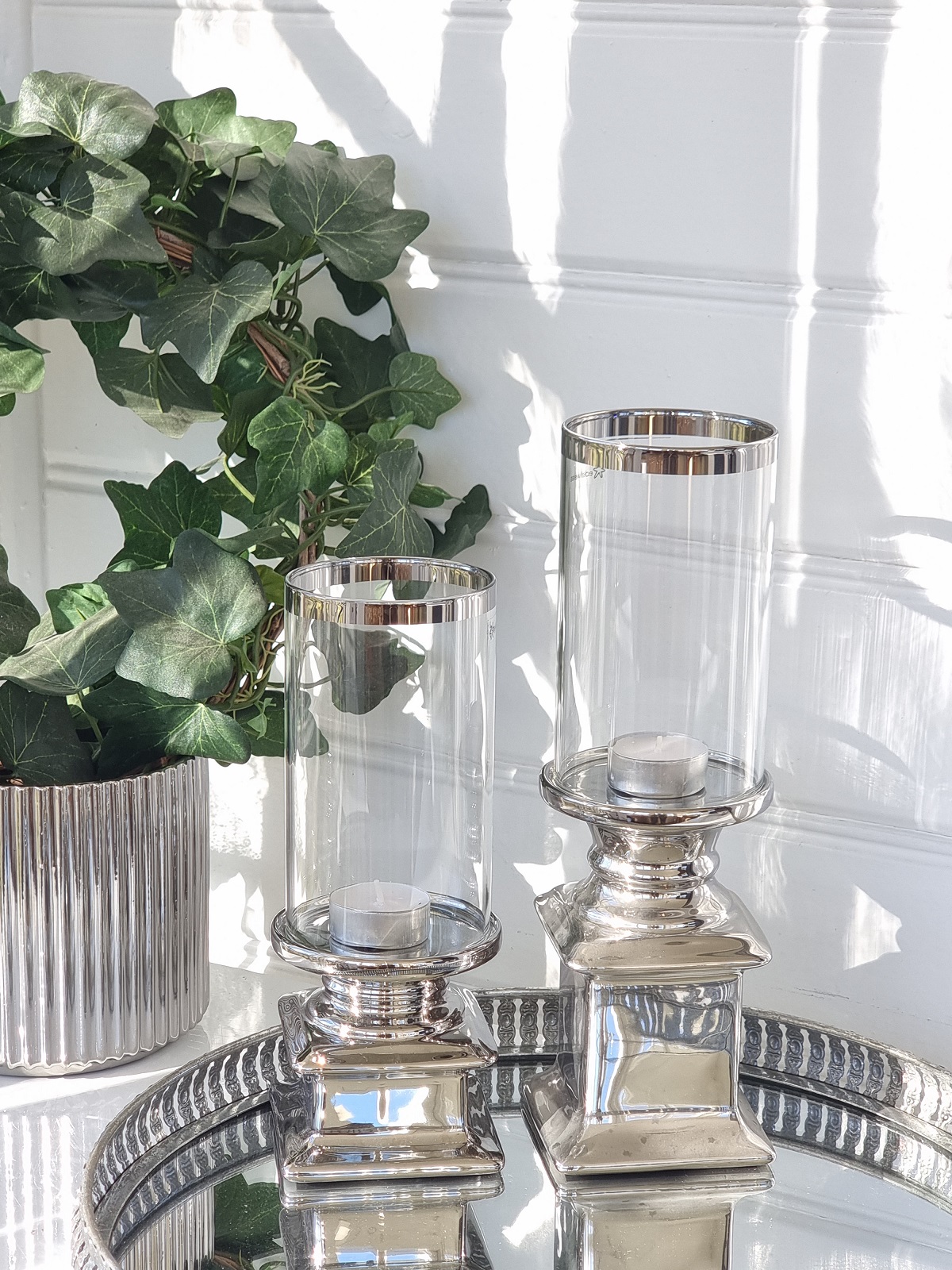 Ljuslykta i silver med glascylinder. Letar du efter en stilren ljuslykta i silver? Gärna en ljuslykta i glas och silver? Ljuslykta i silver för inredning och dekoration på bordet men även på en ljusbricka med andra ljusstakar.