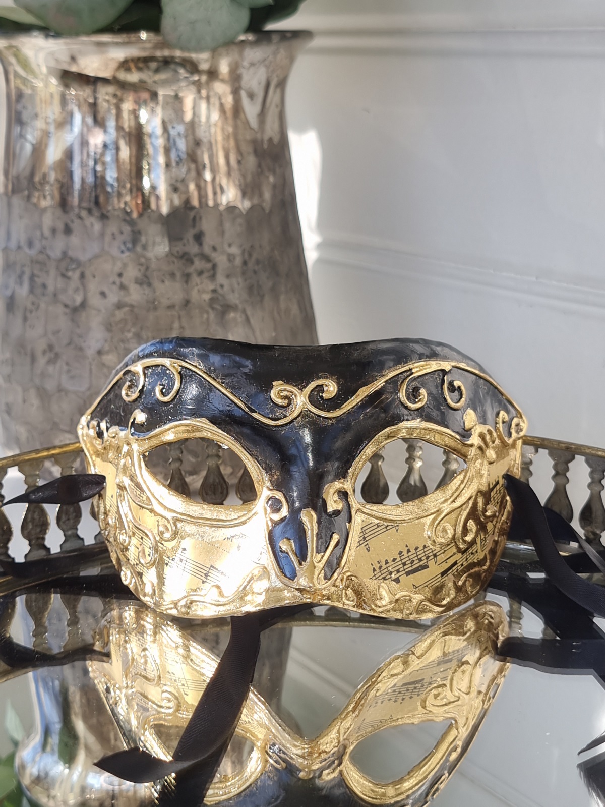 Maskeradmask svart och guld med noter. Dekorativ mask i svart och guld med noter som dekoration.