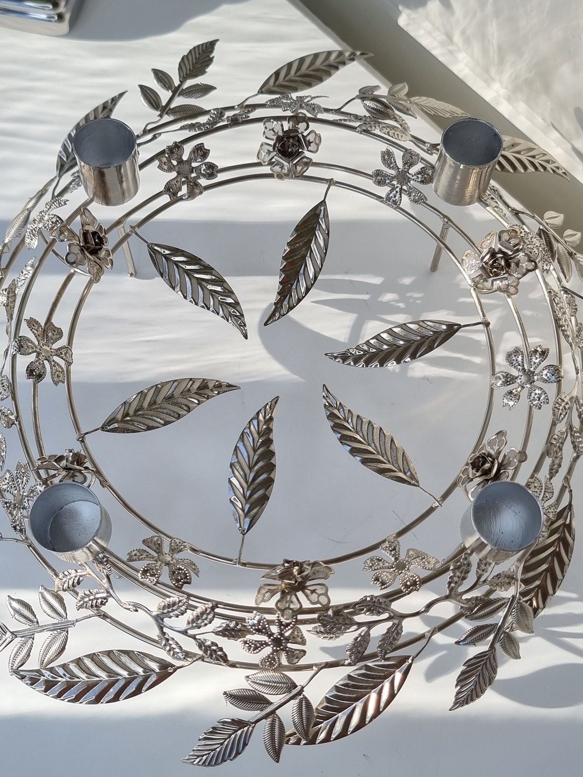Rund adventsstake i silver på ben. Adventsstake med filigran dekoration till kronljus.