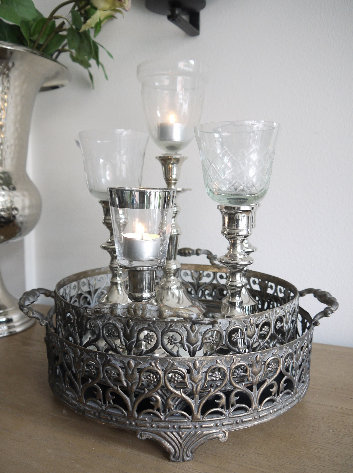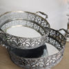 Rund spegelbricka i lantlig stil med kant i metall med ett vackert hålmönster. Handtag på brickan som står på små fötter.