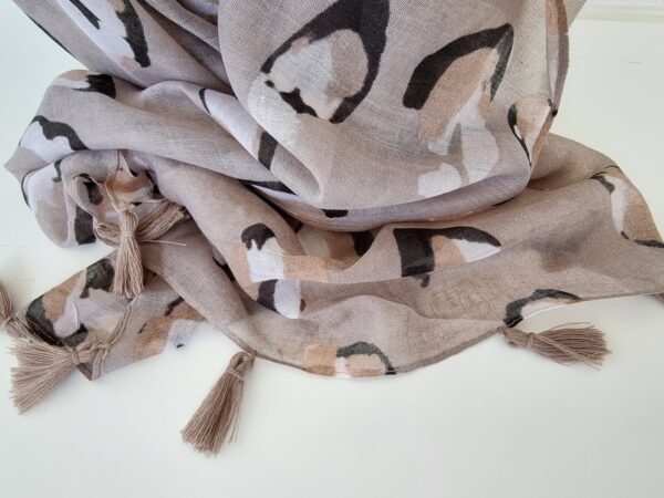 Sjal med tofsar och djurprint. Scarf i färger som passer det mesta med tofsar och mönster med djurprint.