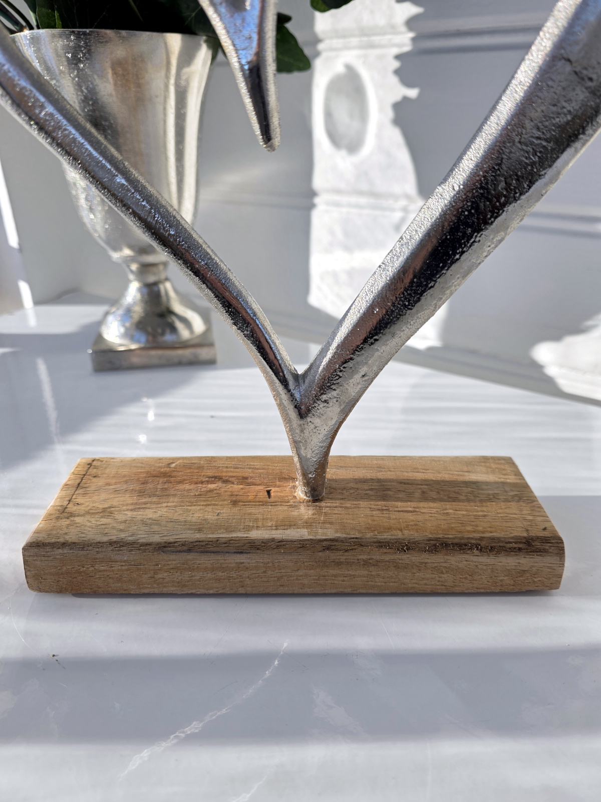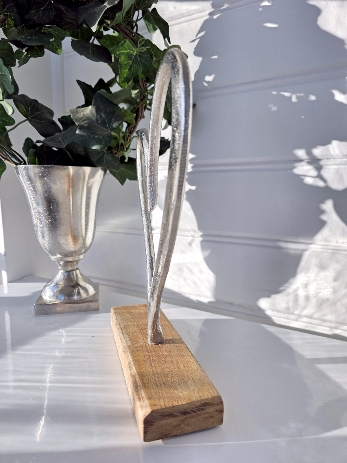 Stort stående hjärta i ruff silver metall på en träfot för dekoration.