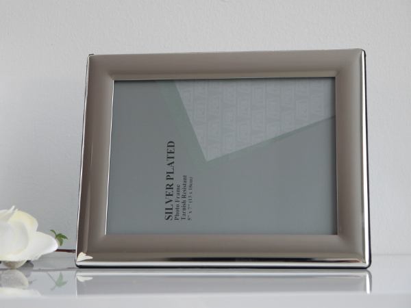 Stilren silverfärgad fotoram med bred kant. Tidlös fotoram med måtten 13 x 18 cm (12 x 17 cm syns) med silverfärgad bred kant.