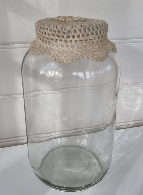 Stor förvaringsburk i glas. Förvara det du vill ha nära till hands i fina förvaringsburkar som du kan ha stående framme. Stor förvaringsburk i glas är praktisk, rymmer mycket och är fin med den lilla virkade hättan. Fin förvaringsburk till tvättmedel, djurmat, flingor och mycket mer.