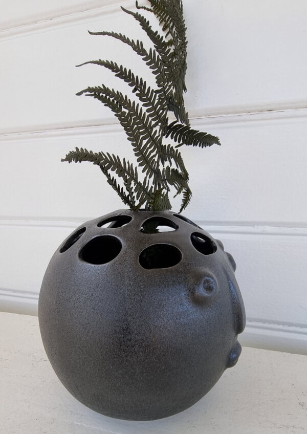 Svart huvud som vas till enstaka blommor eller kvistar. Dekorativ och lite annat än en vanlig vas i svart stengods.